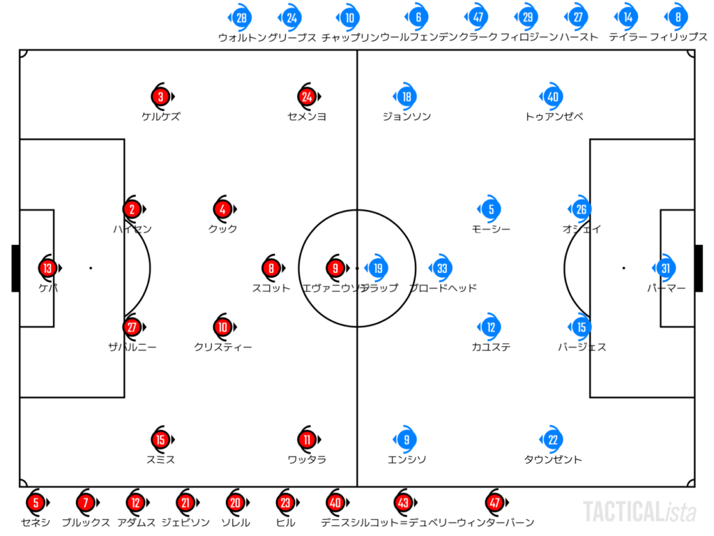 優勢だったのはボーンマスだが、イプスウィッチも少しずつSBの背後を取る2人のSHから押し返すきっかけを作る。すると30分過ぎには先制点をゲット。左サイドのポストで押し下げるきっかけを作ったデラップから、エンシソを起点に横断すると、逆サイドのブロードヘッドがフィニッシュ。ケパの股下を抜く冷静な一撃でリードを奪う。