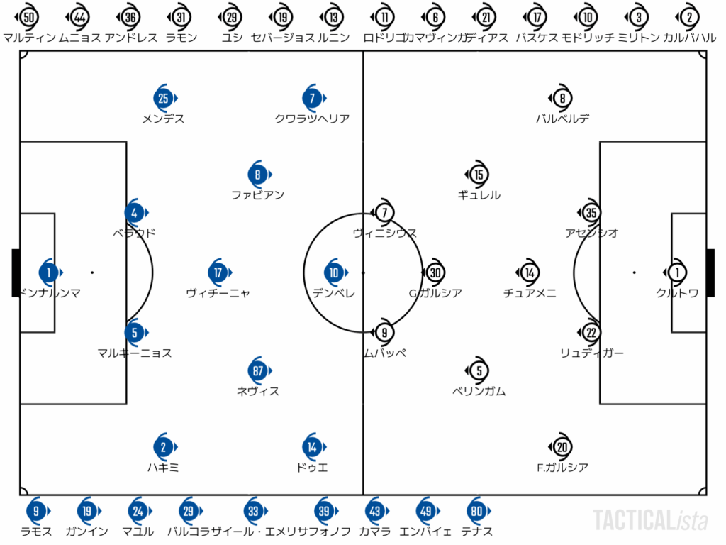 追いかけたいマドリーだが、あいにく2トップはエンバペとヴィニシウス。プレスで相手からボールを奪うという点ではおよそ適していない人選である。