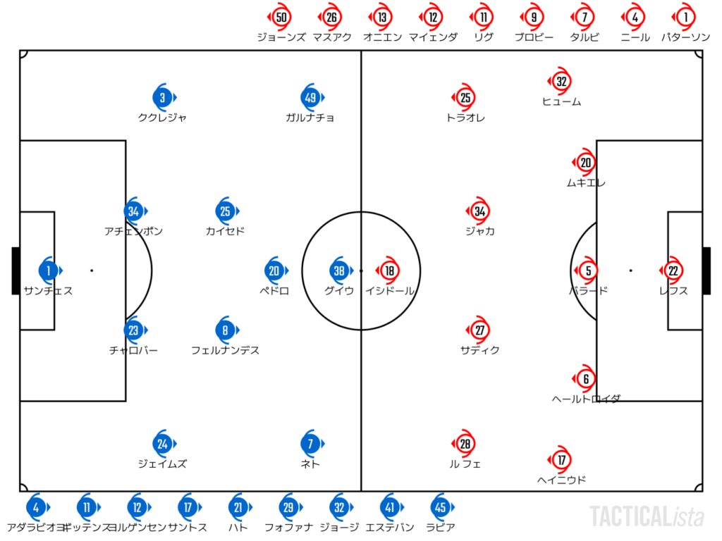 可変多めの左サイドにはジャカのフィードでボールを供給。サディクが低い位置を取るアクションに呼応するように高い位置をとるヘイニウドがル・フェーをフォローする。右サイドはライン間のリグにボールが入ると、そこから奥に侵入を狙う。イシドールやル・フェーの裏へのパスからチャンスを作っていく。