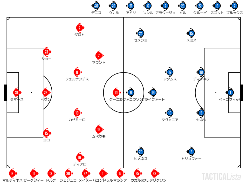 Man Utd:13′ ディアロ, 45+4′ カゼミーロ, 77′ ブルーノ・フェルナンデス, 79′ クーニャ