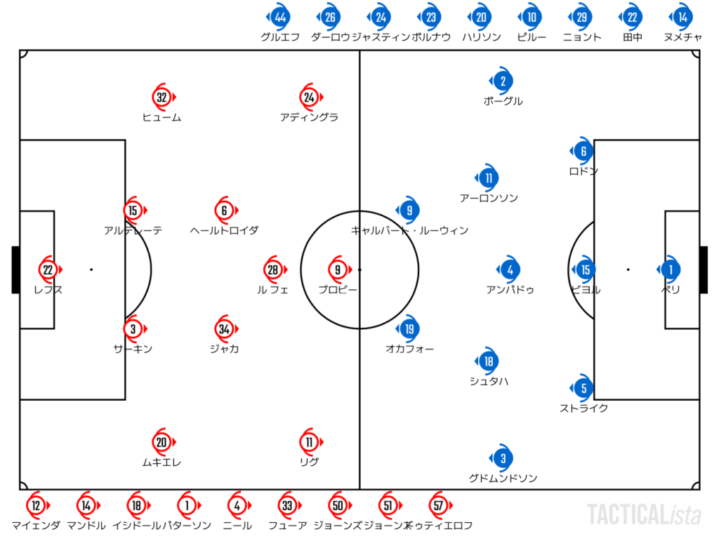 リーズはロドンの負傷交代により、田中を投入しての4バックに強制的にフォーメーション変更を強いられる。この変更が逆に試合を動かすきっかけに。前からの積極的なプレスからテンポを掴んでいく。