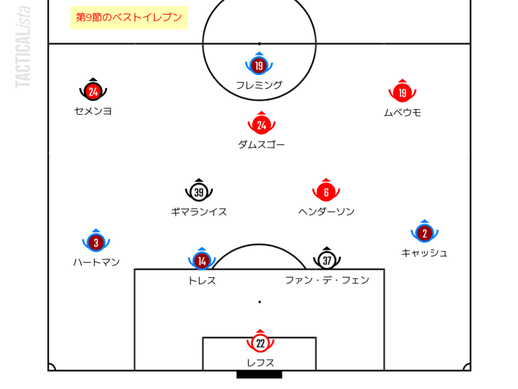 とりわけ良くなかったのは後方の1on1を許容したことだろう。反転の自由度が増すマンツーはマッチアップで有利に立てばクーニャ、エンベウモが大暴れできる土壌。ピッチ中央でボールを引き取りながら加速していく。
