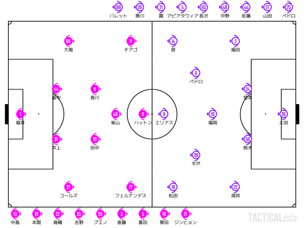 だが、そんな状況もこの両チームのテンションを鎮める材料にはならず。依然としてC大阪は強度十分のハイプレスを敢行。ファストブレイクにおいても左サイドのチアゴ・アンドラーデからのファストブレイクで穴を開けていく。右サイドからはルーカスと交代で入った本間も縦に速い攻撃からチャンスを作っていく。