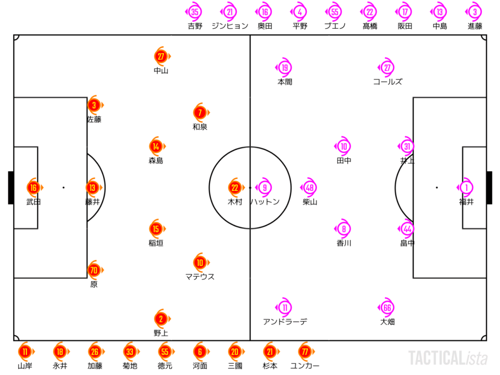 後半は名古屋の左サイドのカウンターが刺さった印象。中山、マテウス、木村などのコンビネーションからゴールに迫っていく。