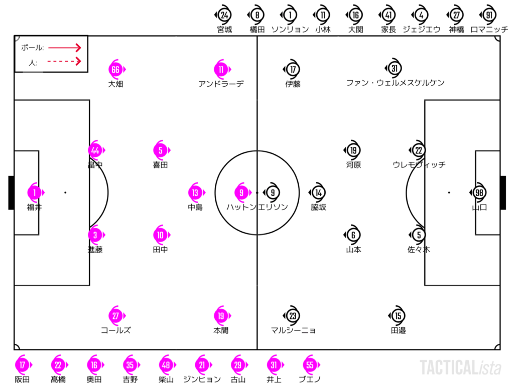 守備面での課題も川崎と似ている。前からのプレスには意欲的だが、CF-SHの連携が切れてしまってSHの背後を使われて横断を許したり、CFと2列目の間をコンパクトに保つことができず、相手のCHに前を向かれてしまったりなど。押し込まれるとなかなか陣地回復のきっかけを掴めないところもどこか予習していて見覚えがあった。