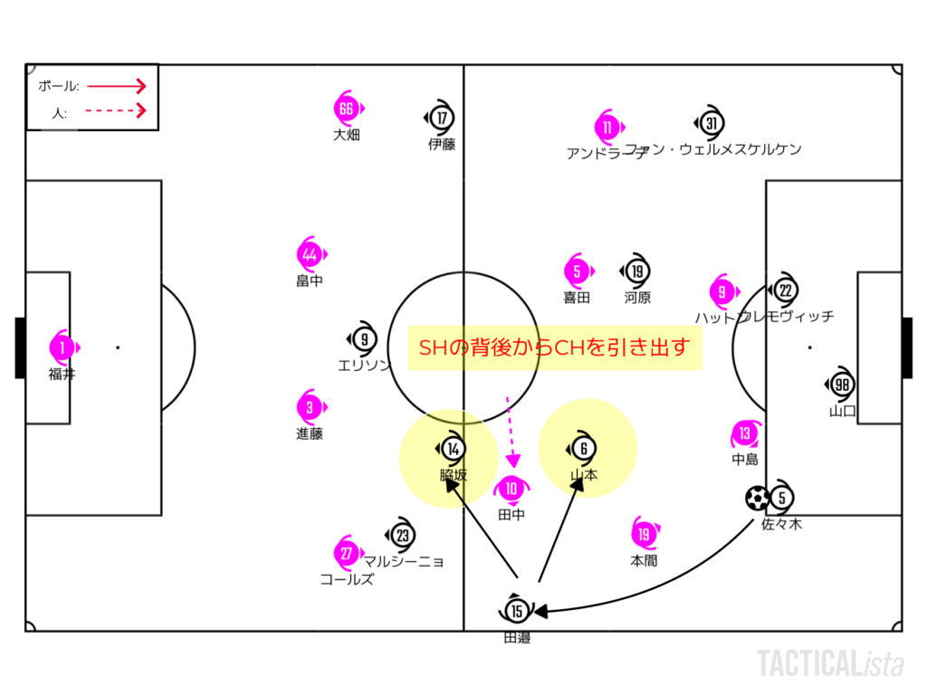 ただ、相手を壊すというイメージで言えばやはりポゼッションから動かしていきたいところ。前への意識が強いSHの背後を取ることで、相手のCHをスライドさせながら横断のきっかけをつくりたい。