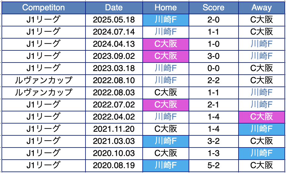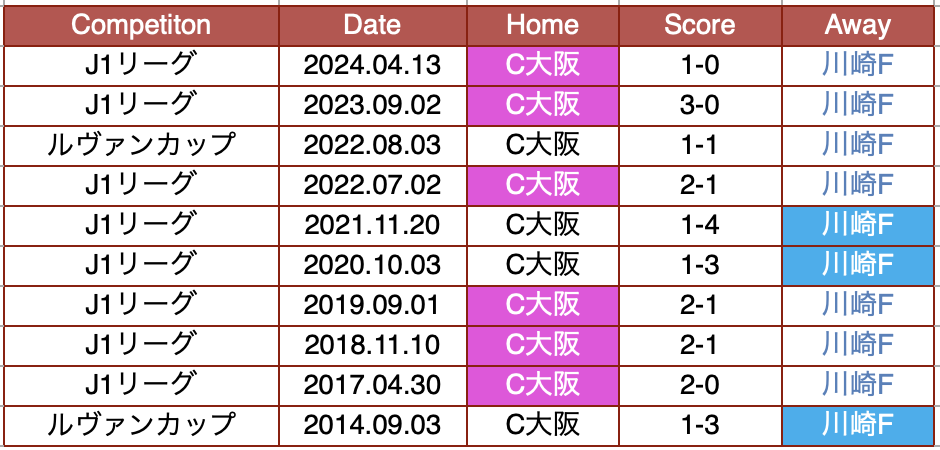 直近5年間の対戦でC大阪の4勝、川崎の5勝、引き分けが4つ。