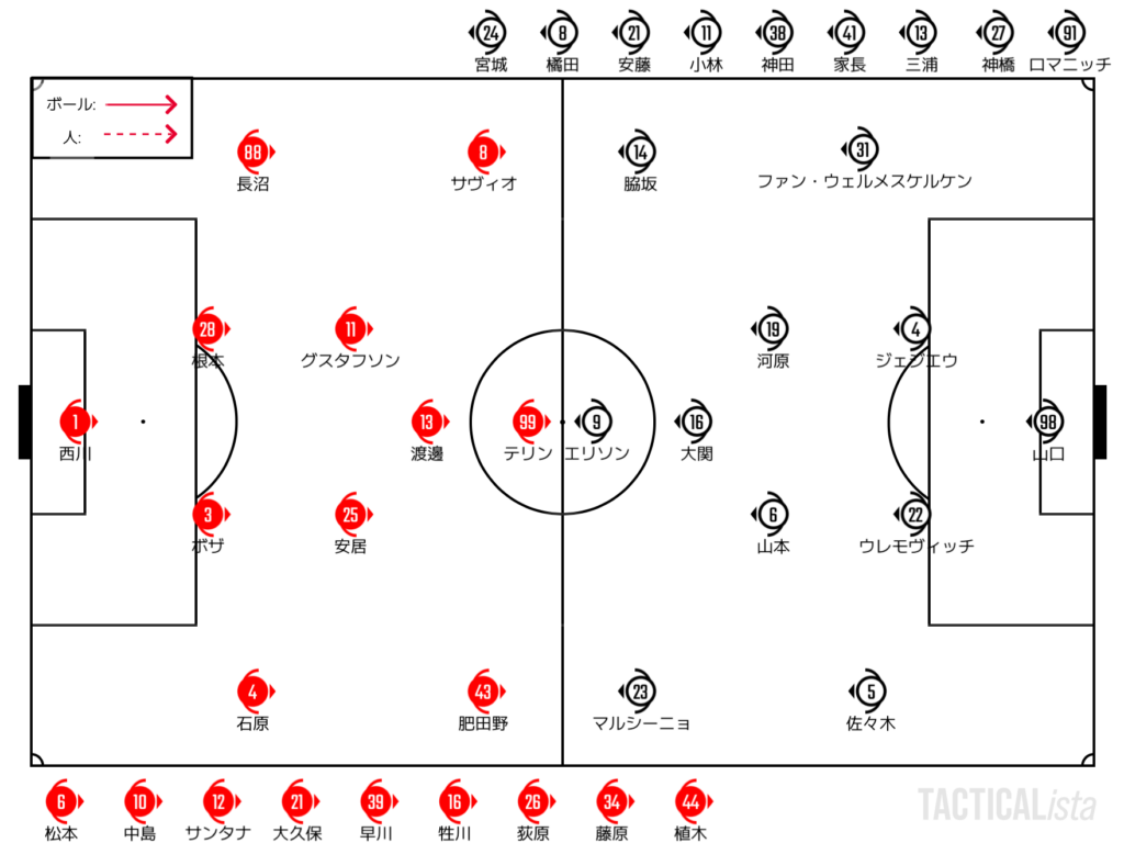 中身を見ていると定点攻撃のポイントを作れないところに苦しさを感じる。石原の絞りや関根の列落ちなど4-4-2から一手間を加えて中盤を3枚にしてのビルドアップを行うのが今の浦和の組み立て。サンタナ、小森に代わって中央を務めることが増えたテリンはポストワークから距離の近いパスワークを行うというスタイル自体は中央密集な陣形とは相性はいいと思うが、いかんせんインサイドは狭い。