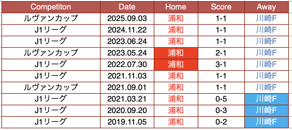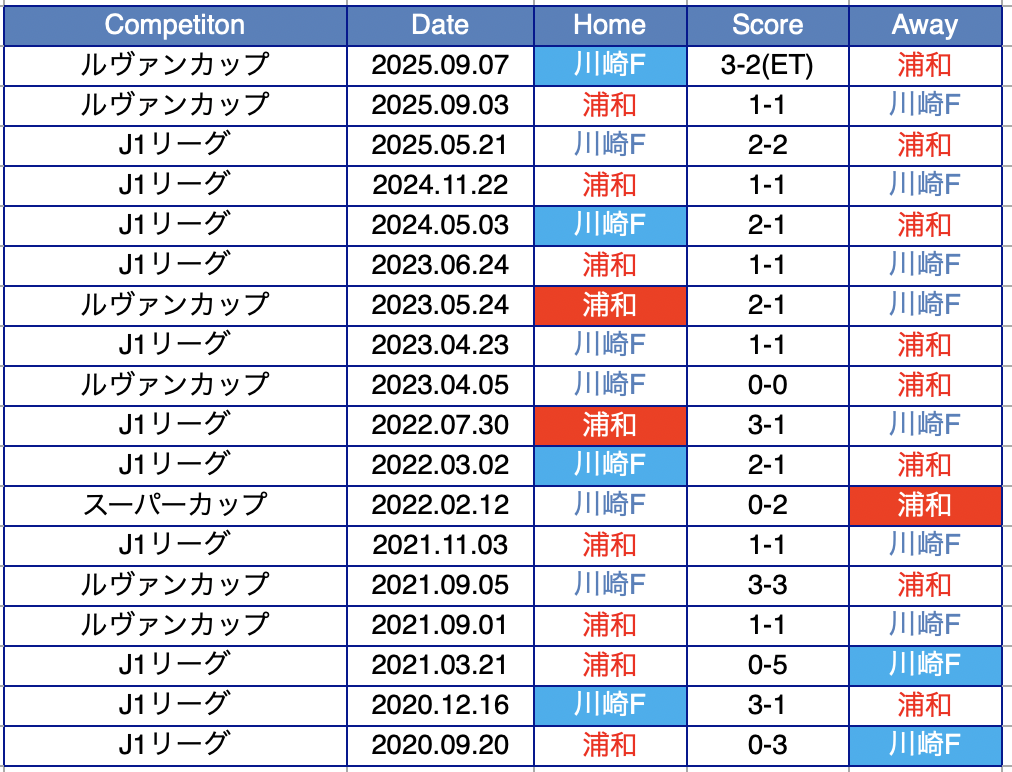 直近5年間の対戦で浦和の3勝、川崎の6勝、引き分けが9つ。