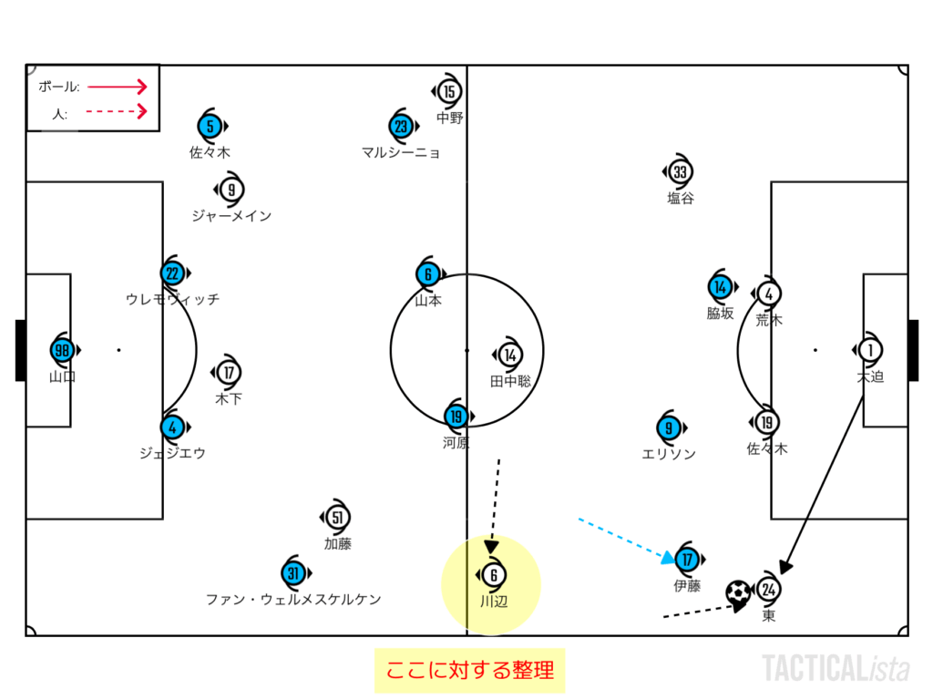 サイドに相手を誘き寄せて背中を取れれば、浮いた伊藤からのドリブルでの加速も当然期待はできる。より難易度の高いチャンスメイクであるが今の伊藤と広島のDF陣のマッチアップは見たいところ。GKを活用しながら左サイドで選手を浮かせるムーブまで持っていくのはなかなか難易度が高い気もするが、ぜひトライしてほしい。