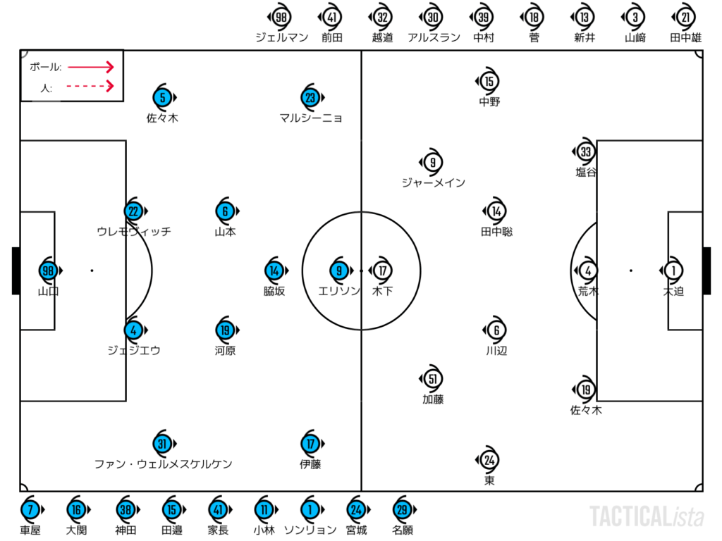 一方で運動量以外のところで数的優位を作ったり生かしたりする点に関してはあまり得意ではないと言えるだろう。純粋な走力でプラス1を作る点で言えばJではトップクラスではあるが、ポゼッションで相手を引きつけながら構造を生かして相手のゴールまで迫っていくところまでは課題が残る。