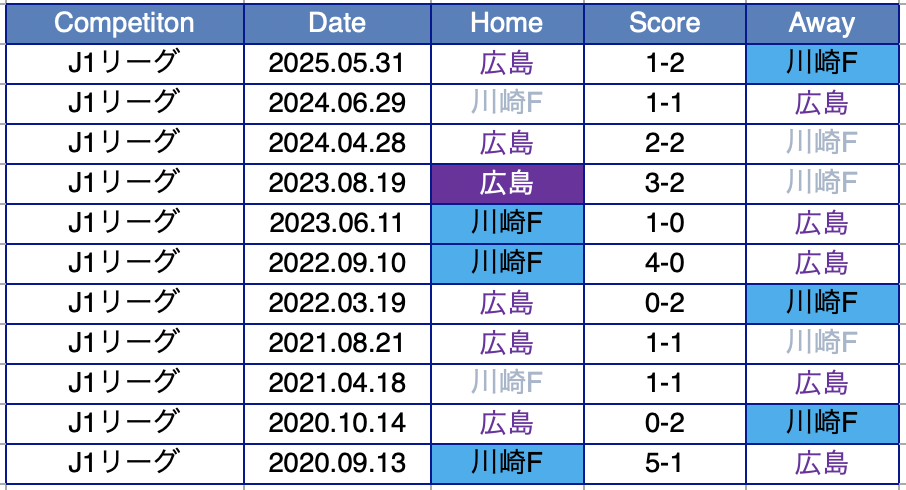 過去10戦で川崎の6勝、広島の2勝、引き分けが2つ。
