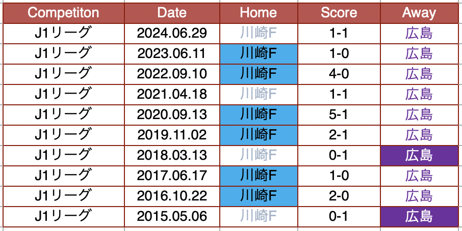 直近5年間の対戦で川崎は6勝、広島の1勝、引き分けが4つ。