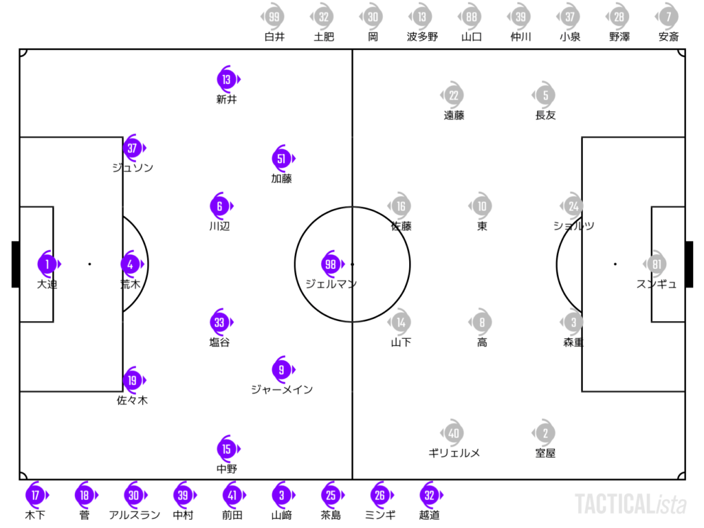 しかし、これはFC東京のサイドの粘り強い守備が光っておりなかなか突破することができず。守備側の強度が目立つ立ち上がりとなった。