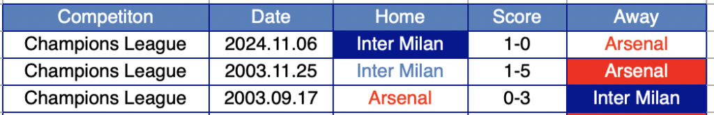 過去の対戦でインテルの2勝、アーセナルの1勝。