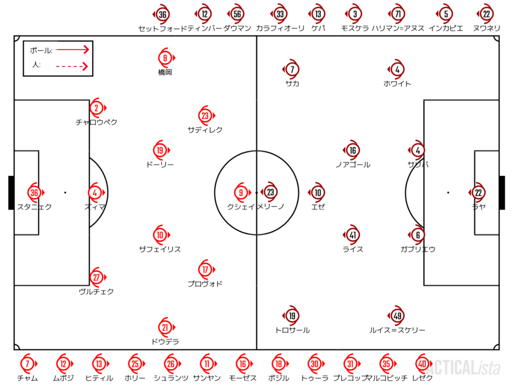 クロス対応という点では抑えるポイントはアーセナルの右サイドの絞り。WBに背中を取られて出し抜かれるという形には警戒が必要である。ポゼッションの要素が増えてくる場合は、アンカー役の19番のドーリーがリズムを司るので、ここのマークが必要。メリーノ、エゼ、ヌワネリあたりはまずはこのポイントをどう抑えるかを整理して望みたいところだろう。