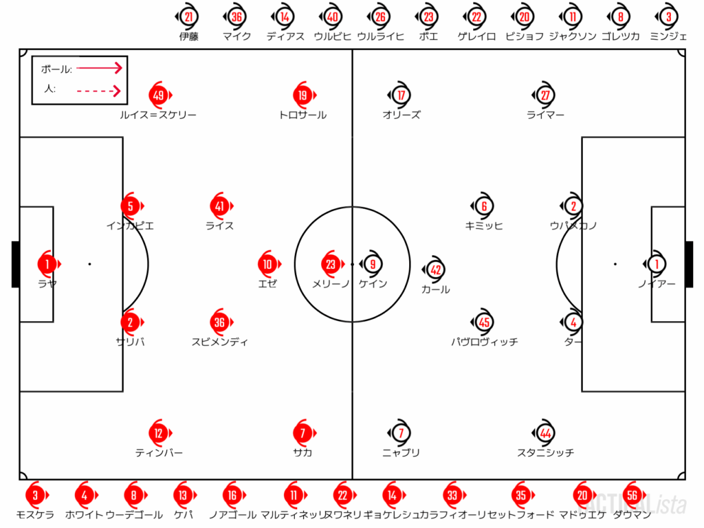 攻略においてはファーサイドなどノイアーのリーチが届かないところにボールを置き、折り返しでの競り合いを制し続けることでオープンな状態でシュートまで持っていければ理想。それだけにガブリエウの欠場は手痛いところである。