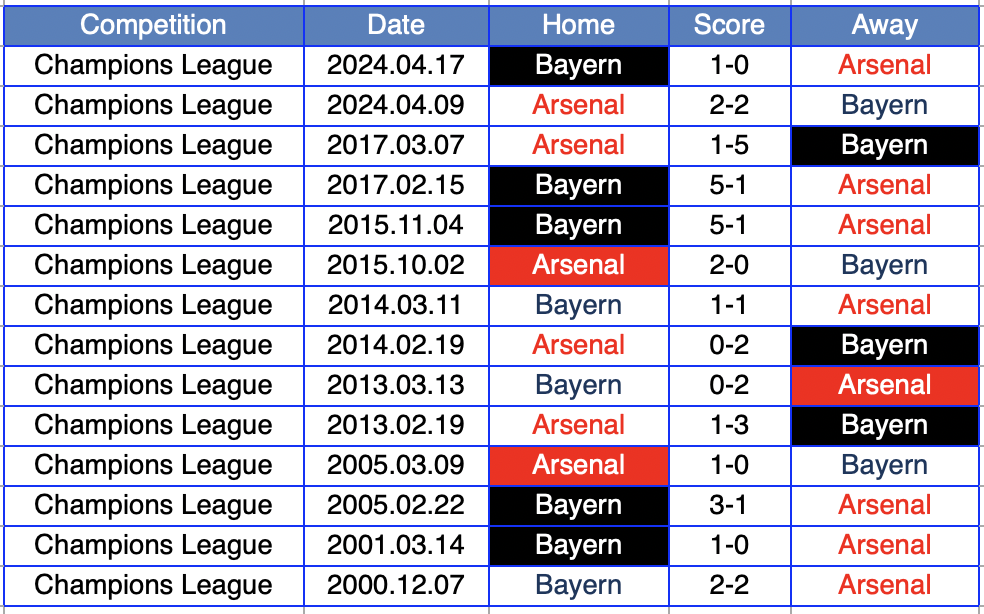 過去の対戦でアーセナルの3勝、バイエルンの8勝。