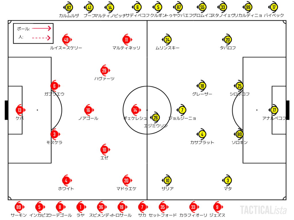 100%プレータイム管理優先でいい試合。ライス、メリーノが出場停止であるが、スビメンディも同時に休養させて何ら問題はない。ノアゴール、エゼ、可能であればハヴァーツの3枚で中盤のスターターがこの試合のベストの選択肢だと言えるだろう。