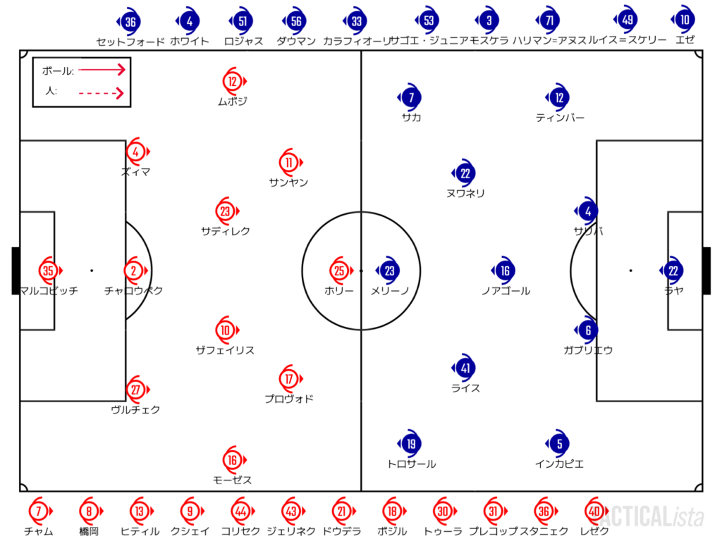 一方のアーセナルはカラバオカップからハリマン=アヌスをこの試合でも投入。中央に入りながら、低い位置に下がりつつボールを触るなどうまく試合に入れていた。