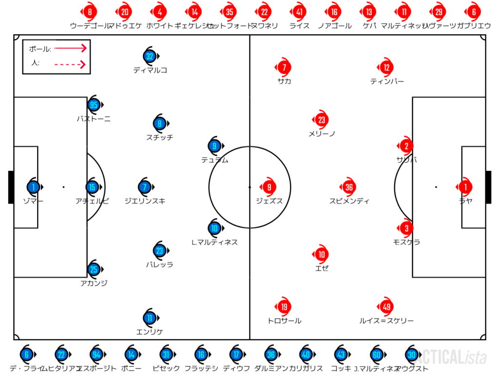 やや狭いスペースの崩しではあったが、ルイス=スケリー→ティンバーの横パスが通ったことが得点のきっかけとするのであれば、その手前のエゼとメリーノの細かい縦パスが作り出した奥行きを活用したこととなる。特に縦パスを入れたエゼのプレーは彼らしい駆け引きから生まれたもの。この試合ではなかなか受ける頻度は上がらなかったが、彼らしいプレーの兆しが得点に繋がったことは朗報だと言えるだろう。