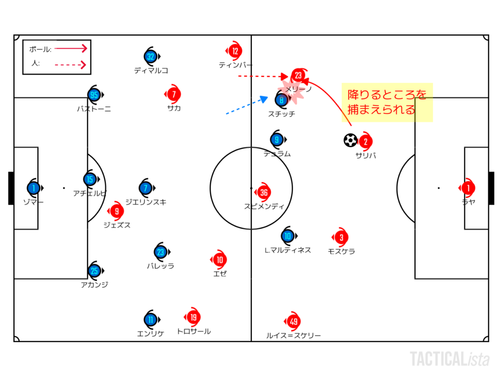 ただ、メインとなる解決策はもう1つの方だろう。スビメンディのサリーでバックラインを3枚にする形である。インテルのような2トップに対してまずつっかけていきたいのは2トップ脇のスペースなのだが、このスペースをアーセナルが絞るSBや降りるIHで突こうとするとインテルのIHが3枚目のプレス隊として迷わずついてくる。