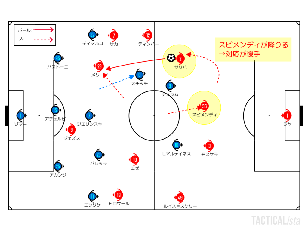 アーセナルは試行錯誤した結果、スビメンディが最終ラインに入り、3バックのように変形することでCBが2トップの脇をつく形に辿り着く。この形であればインテルの守備陣がついてくることはないということがわかったのだろう。開くサリバからボールを運ぶシーンがアーセナルは出てくるように。