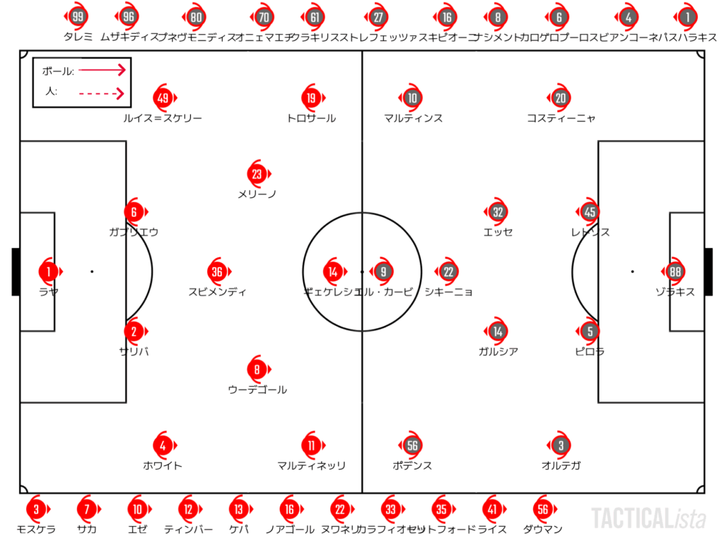 アーセナルが4-4-2のローブロック気味に構える形で守備を行う状況に対しては、自由にボールに動くマルティンスがドリブルで対面を揺さぶりながらサイドに展開してクロスを上げていく。基本的には安定しているアーセナルの守備だが、左サイドのローテーションは不安定。こちらのサイドから上がったクロスがポデンスの決定機を生み出すが、ラヤのファインセーブでアーセナルは失点を回避する。