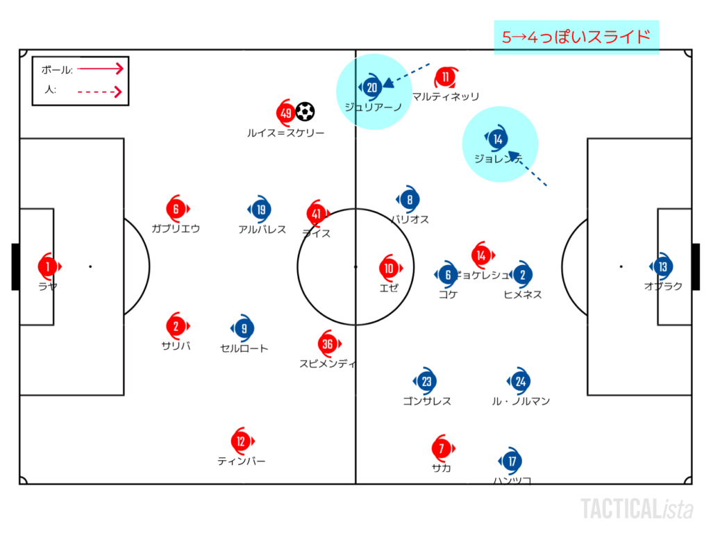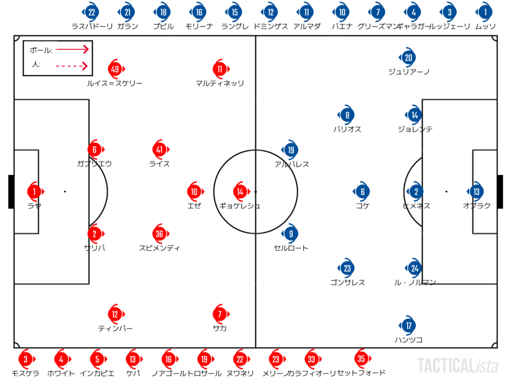 立ち位置勝負という観点からまずアーセナルが仕掛けたのは左サイドのルイス=スケリー。相手の3CHに微妙に届かない位置に立つことでアトレティコのDF陣に対応を迫る。初めは右WBのジュリアーノはマルティネッリに専念していたが、徐々にジョレンテがマルティネッリにスライドし、ジュリアーノがルイス=スケリーにチェックに出て行く4-4-2に近い形になっていた。