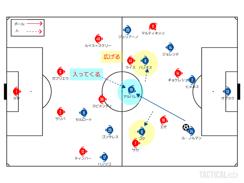 サカの突破力を活用しつつ、サカを軸とした彼の引力を前提とした逆サイドの生かし方も抑えておく。こういう攻め筋のバランスがいいのが今のアーセナルでもある。