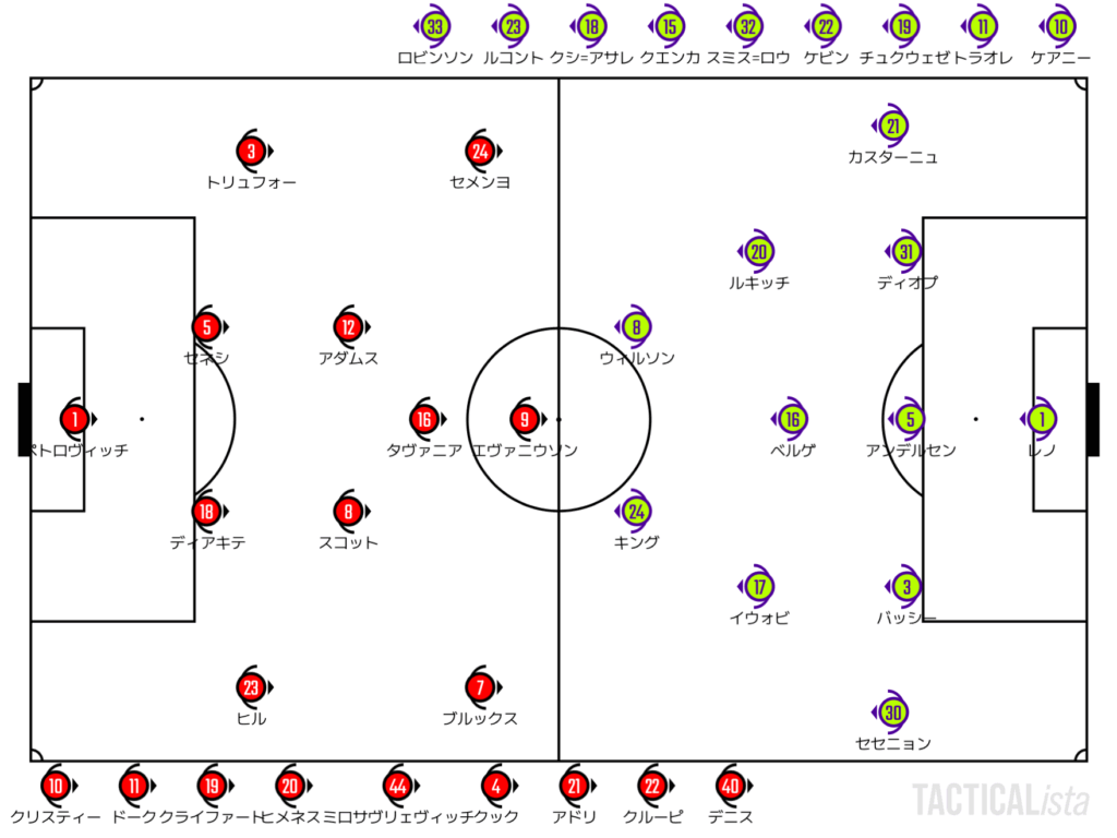しかし、ボーンマスはウィルソンとカスターニュの間のスペースが空くところから前進。高い位置を取るトリューフォーが左サイドに起点を作ることで前進する。同サイドにフォーカスするだけでなく、横を揺さぶっていくボーンマス。バックラインからの対角のパスからチャンスを作ったかと思えば、縦に早くエヴァニウソンへのパスをつけるなどあらゆる形でフラムを攻め立てていく。