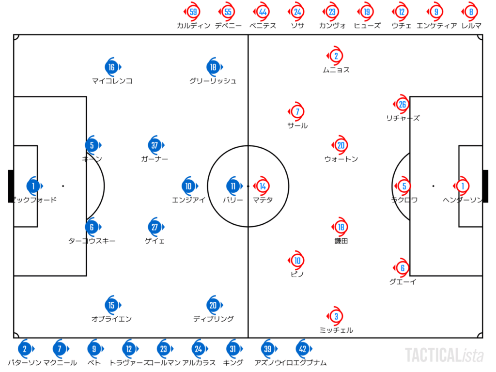 しかしながら、パレスはカウンターから反撃。得点シーンのようなクリティカルなチャンスに拍車をかけていたのはピックフォードの不安定な飛び出し。後方をぽっかりと開けてしまうことで、大きなピンチを迎えていたが、オブライエンのライン上でのクリアなどなんとか追加点を許さない。マテタ、サールといった面々は決定機を仕留めきれなかった。