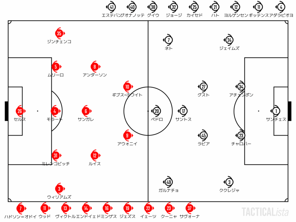 時間の経過とともにフォレストは保持の時間を増やす。3CHにトップ下のギブス=ホワイトもしくはSBのジンチェンコが中盤の4枚目に加わる形から相手のズレを作っていく。だが、定点攻撃はもう一味。長いレンジのボールの精度が刺さればチャンスになりそうな予感はあった。