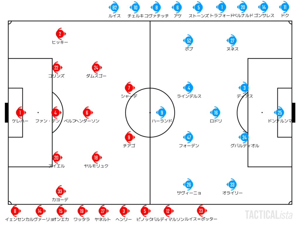 だが、脱出口がなかなか見つからないと再び30分からはシティがポゼッションを強める。ロドリがいなくなってもニコ・ゴンサレスをアンカーに置いたシティは延々とサイドに配球しながらドライブが仕掛けやすい状況を整えていった。