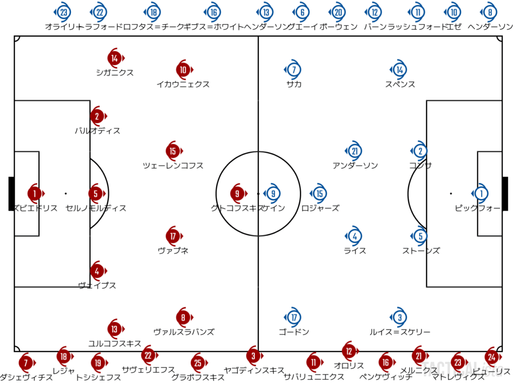 さらにはボールのないところでケインを引っ張ってしまったラトビアはPKを献上。前半終了までに3点のビハインドをラトビアは背負うこととなった。