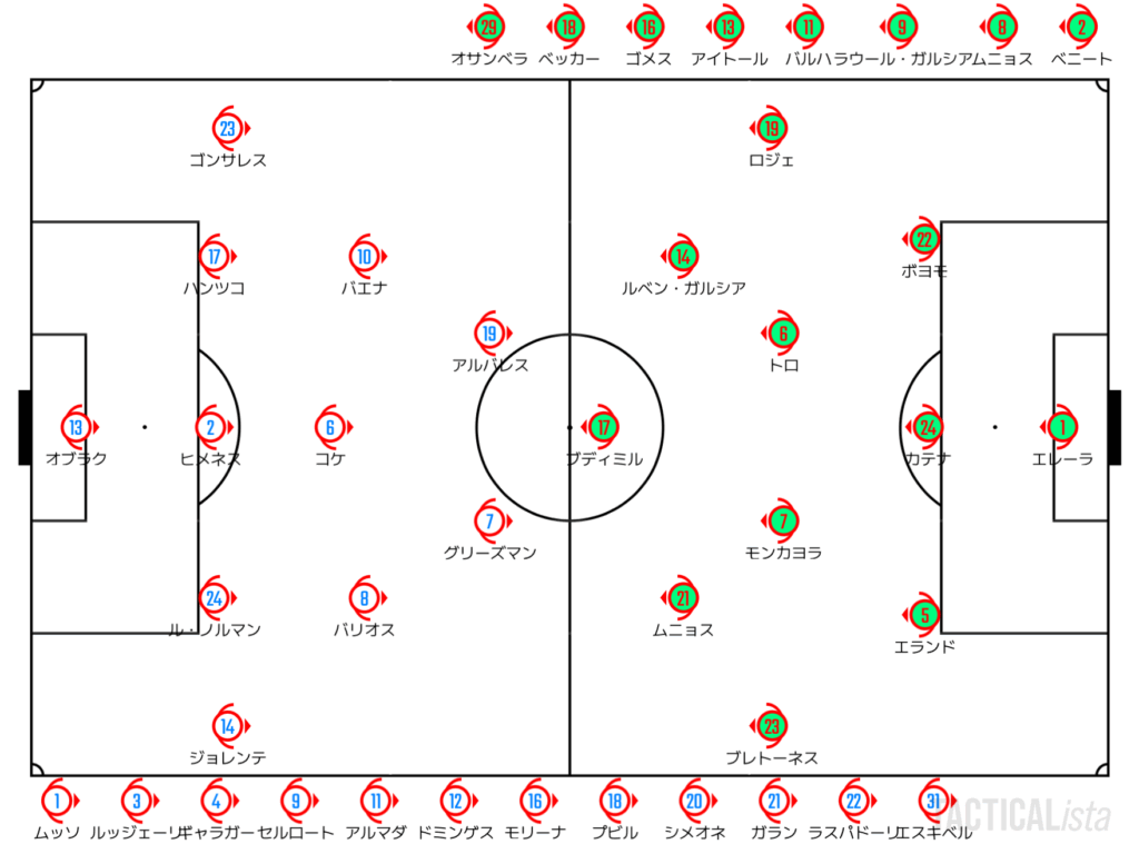 前線ではアルバレスが広い範囲を動きながらの仕掛け。バエナへのラストパスは動き出しも含めて見事の一言だったが、グリーズマンが相手のDFに干渉したということでオフサイドを取られてしまった。