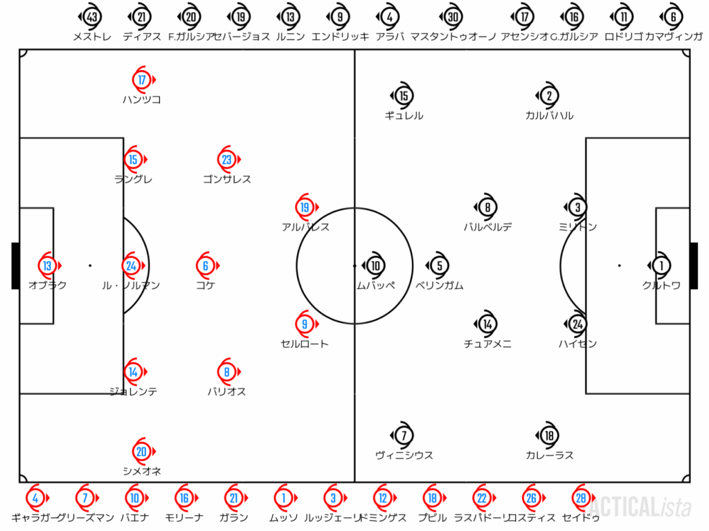 そのアトレティコの保持を咎めるところからマドリーは勝ち越し。左サイドから深さを取るヴィニシウスからギュレルの素晴らしいハーフボレーでリードを奪う。だが、アトレティコも前半終了間際に同点。コケ→セルロートのクロスから追いつく。ヴィニシウスの突破、ハイセン周りの空中戦など互いの2点目はそこを継続して狙うような素振りも見える攻め筋だった。