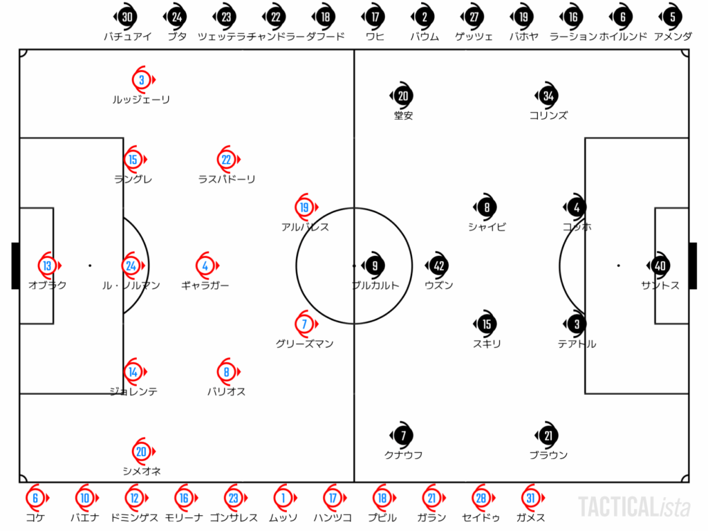 得点をとって以降もペースはアトレティコ。ねっとりとした非保持で攻撃を防ぎつつゆったりとした保持からチャンスを作っていく。ワイドのアルバレスとシメオネは引き続きチャンスメイク。中盤では前を向くフェーズを丁寧にこなし、ワイドへの展開を図る。