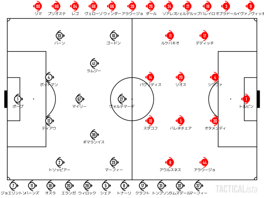 引き続き攻撃に転じた時にはルケバキオが頼りになる存在ではあるが、こちらもゴードンのプレスバックによって封殺。簡単にベンフィカに起点を作らせることを許さない。
