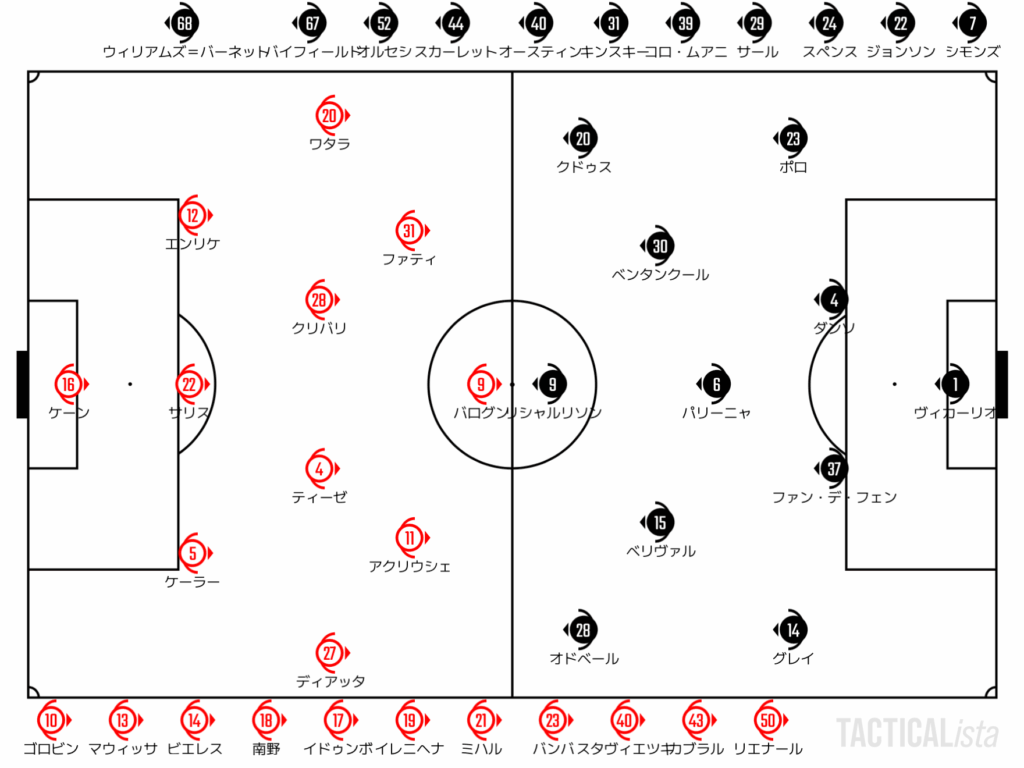 後半も試合は人を捕まえに行く守備の応酬。前から互いに捕まえに行く守備に対して、リシャルリソンとバログンで一気にひっくり返しに行こうという意識が見える。