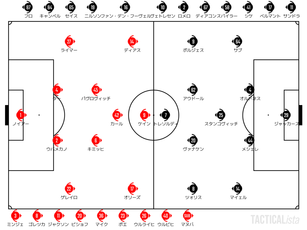 BAY:4′ カール, 14′ ケイン, 34′ ディアス, 74′ ジャクソン
