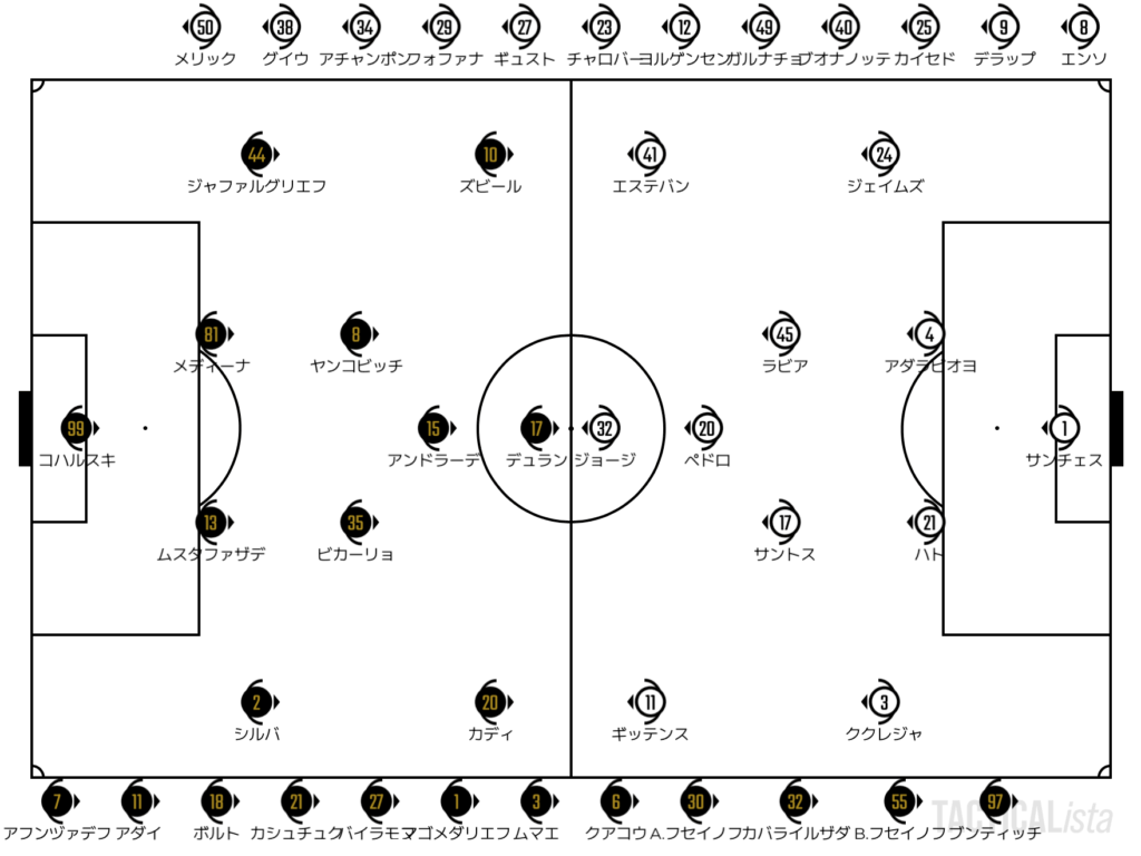 後半も展開は強度寄りのまま。カラバフはハイプレスからの真っ向勝負に加えて、デュランのカウンターなど攻撃においても縦に速い選択肢から解決を図っていく。