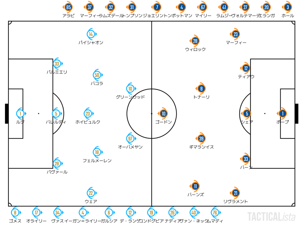 追いかけるニューカッスルはハイプレスからファストブレイクを狙うがオフサイドでゴールは認められず。なかなか同点ゴールを手にできないこともあり、60分には4バックにシフト。即効性があったとは言えないが75分くらいから少しずつ押し込む局面が増えていく。