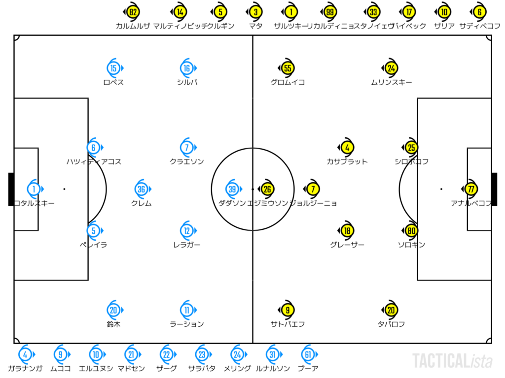 序盤は長いボールをお互いに入れる展開。ロングボールを生かしながら攻撃の形を模索する。保持の形を見つけた感があったのはコペンハーゲン。左右に散らしながら長いボールを入れる機会を伺うなど、ロングボールを入れる下準備を行う。サリーで守備の基準をずらしながら、幅を使った展開でダダソンが決定機を迎える。