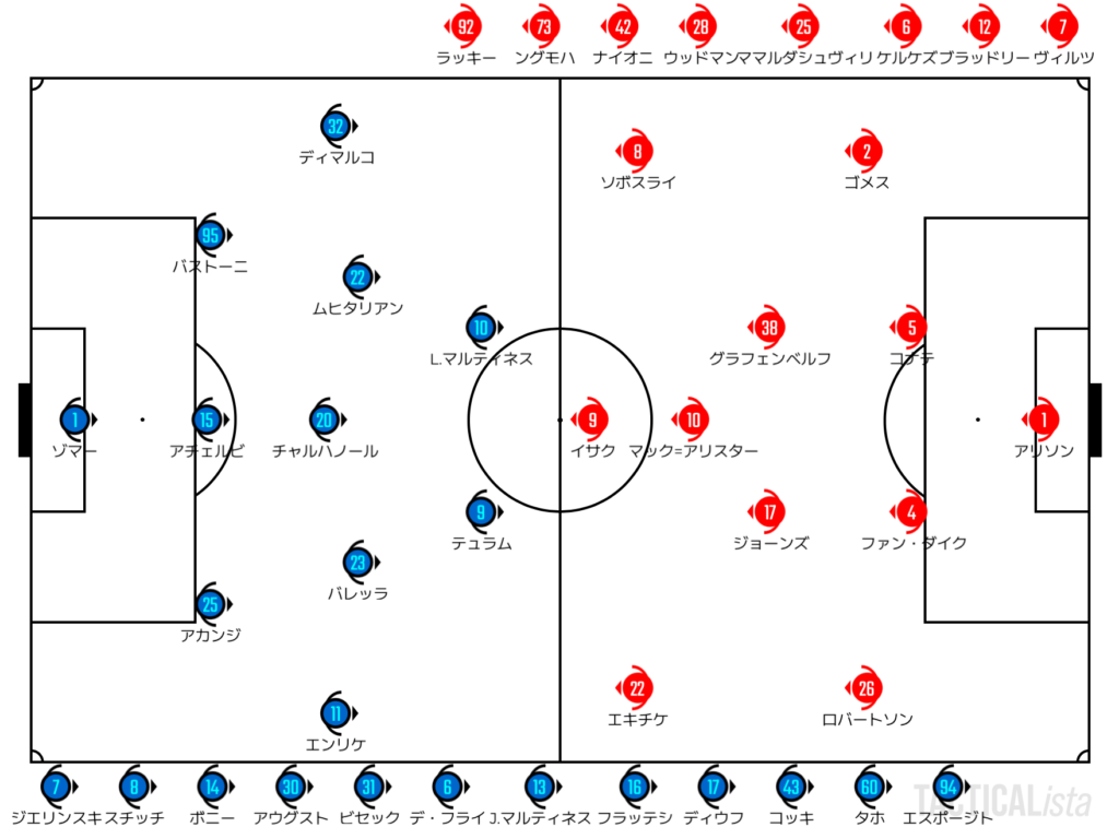 押し込む局面でもインテルは優勢。攻撃時に自由なポジションを取るエキティケは守備の基準が乱れる要因になっていたし、最終ラインに吸収されがちなグラフェンベルフによってマック=アリスターの周辺には誰もいない状態となっていた。