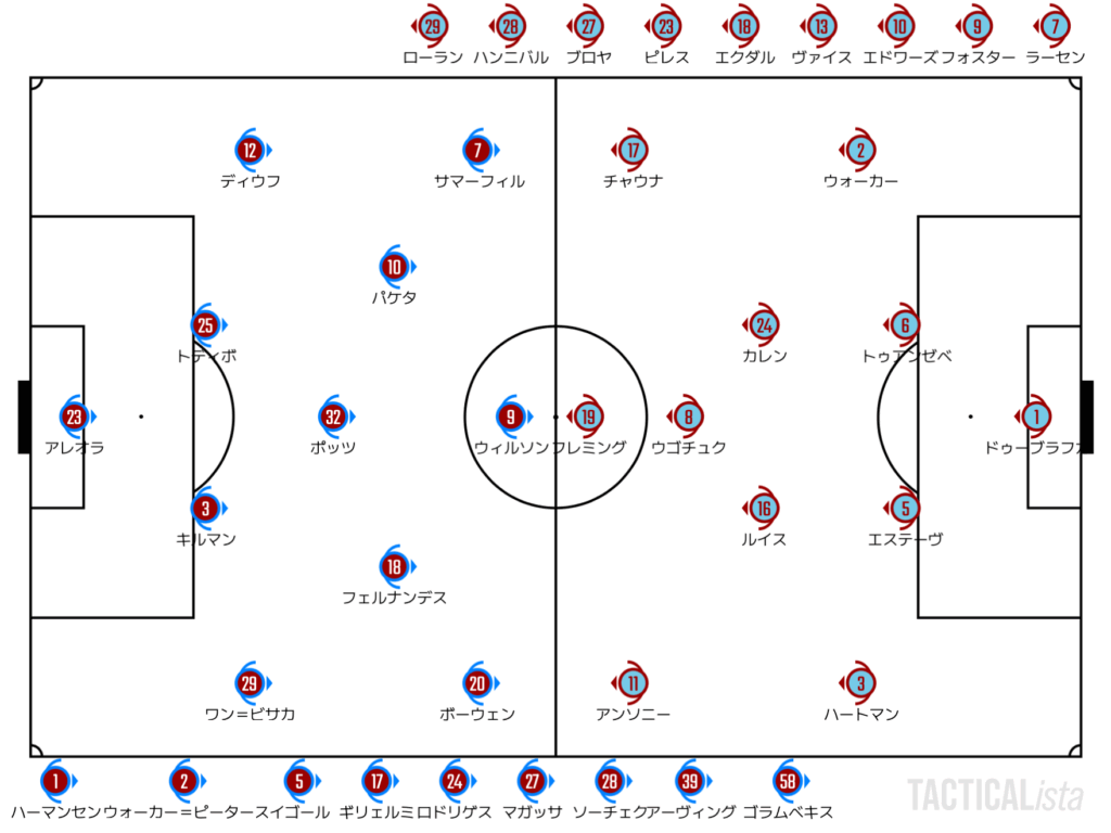 サイド攻撃はその分シンプル。右はワン=ビサカとポッツのコンビネーション、左はサマーフィルの加速による短期突破からチャンスを作る。中盤さえ浮けばこの両サイドへの展開から敵陣に進むことができたウェストハムだった。