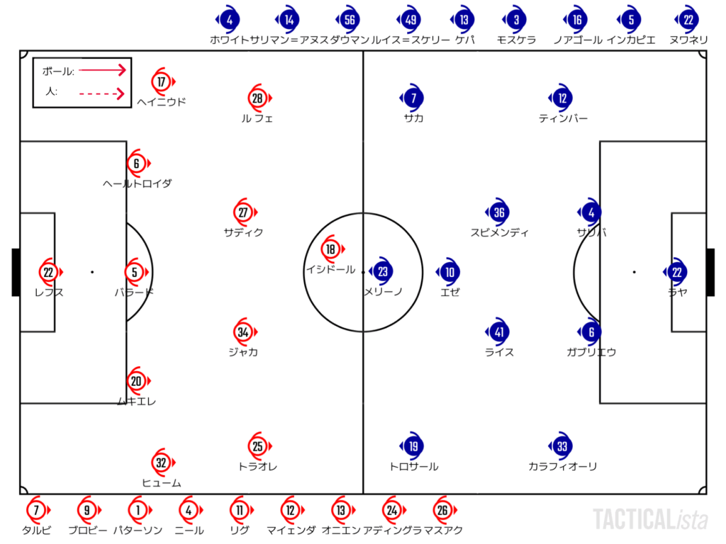 後半、アーセナルはポゼッションからのチャンスメイクに再びトライ。サイド攻撃の自由度を上げることで敵陣に迫っていく。特に左のハーフスペースは集中的に。サカ、ティンバー、スビメンディなど多様なメンバーがこのサイドに突撃していく。