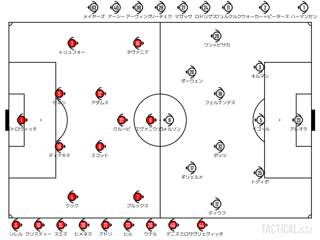 見応えがある序盤戦の割には先制点は非常にあっさりした印象。ウェストハムは結果的にロングボール一発で打開をした格好。ウィルソンがボールを収めると、そのまま一気にゴールまで運んでいった。見事なシュートではあるが、守備視点ではセネシが入れ替わられてしまい、トリュフォーが巻き取られてしまい、ミトロビッチが準備ができていなかった印象だ。