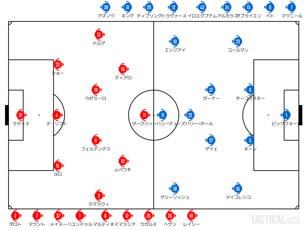 後半、ユナイテッドはワイドにディアロをスライドさせてマウントを投入。幅を使った攻撃を進め、WB→WBのクロスでチャンスを作っていく。押し下げたところからのミドルシュートも含めて、ユナイテッドは多様な攻撃を展開。エバートンは前半のような陣地回復ができなくなってしまい、押し込まれる状況が続いてしまうこととなる。