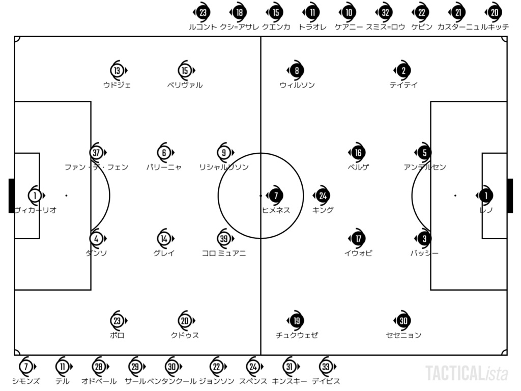劣勢のトッテナムは2トップが左右の背後に流れて時間を作る展開。荒削りながらも少しずつ前に進んでいく。自陣に押し込まれてしまうと少しクロス対応は怖いフラム。だが、クドゥスに前を向かせないところなど要所を押さえる対応は光った。